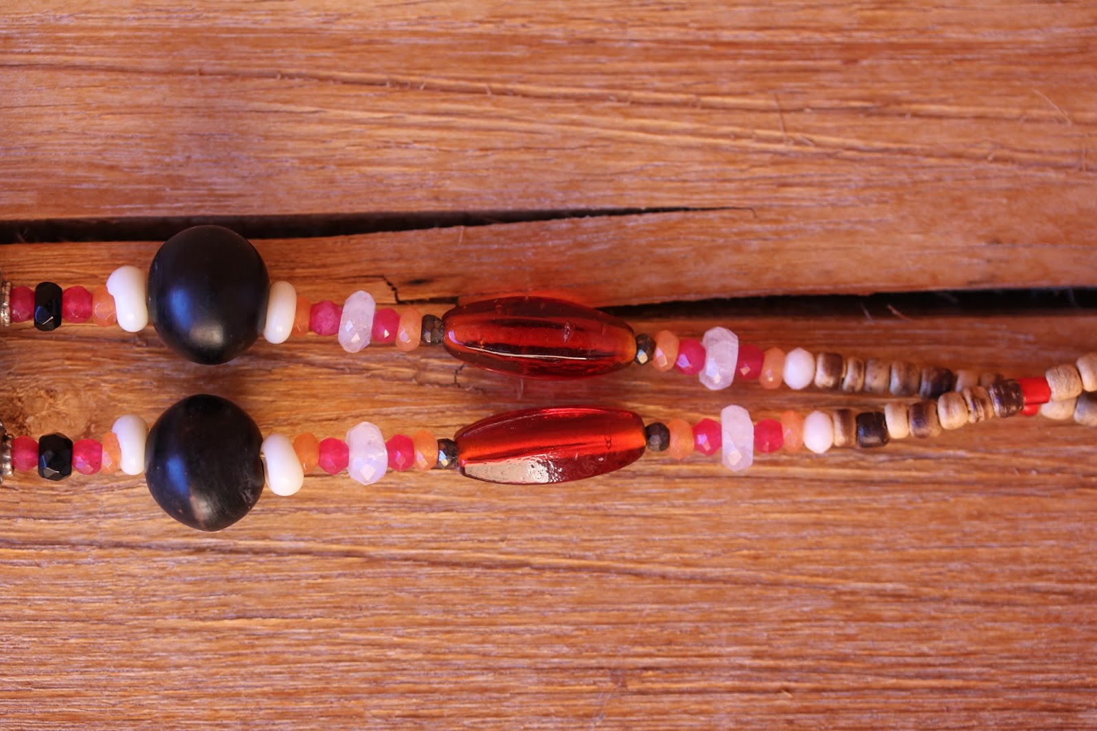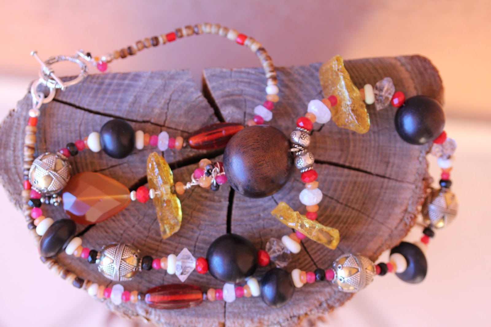 In the first version I have added glass vintage beads, and in the secon one I have added gemstones: amethyst rondelles in different depth of lilac, green cyanite sticks , apatite irregular beads.