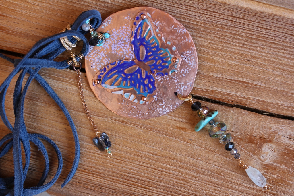 Per una appassionata del blu ho ritagliato una farfalla di rame sbalzato e l'ho sovrapposta ad un disco di rame texturizzato a fiorellini colorati in lilla, per fare volare la farfalla tra i rami di un fiore di pesco.