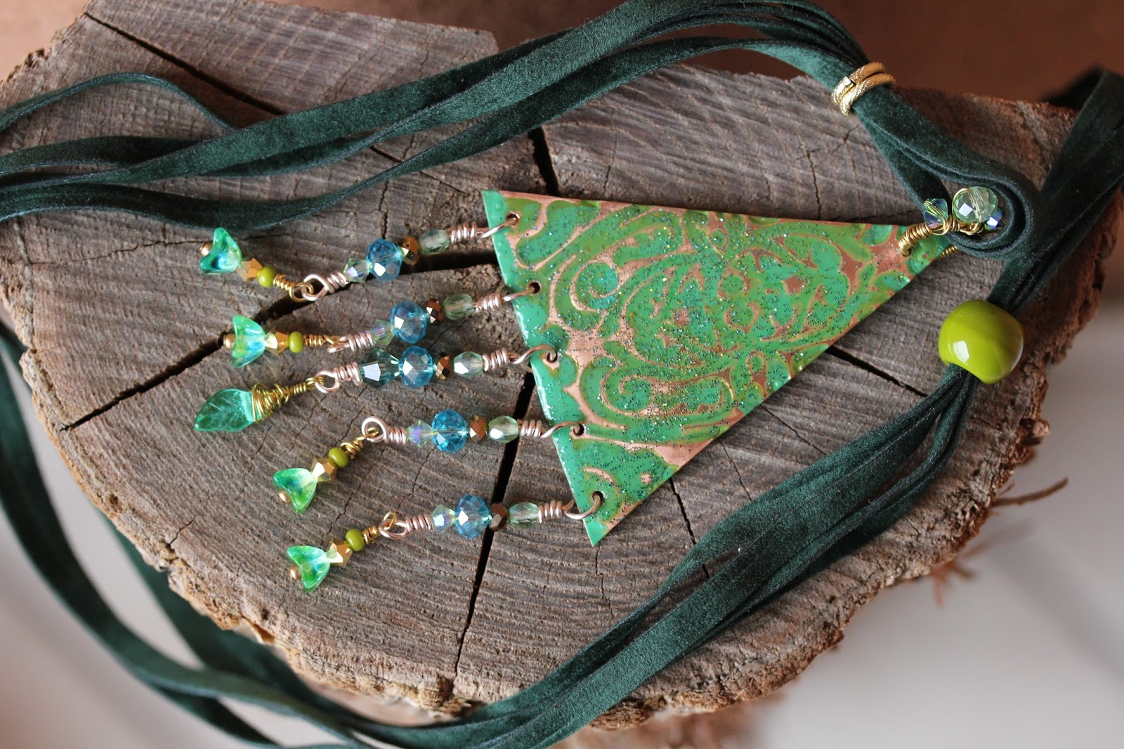 Mi sono divertita ad utilizzare i miei amati chips, pezzettini di pietre dure che ho abbinato ai pendenti in metallo patinandoli con colori simili ai chips. Ecco qui alcuni modelli.