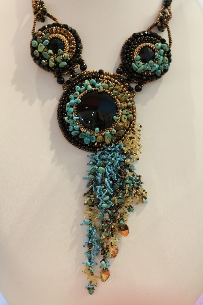 Una tecnica impeccabile ed elegante per l'incastonatura dei cabochon in onice nero rigorosamente "made in Fantasy" cioè appartenenti alla collezione di pietre dure che è possibile acquistare al Fantasy Craft. L' incastonatura classica a Peyote dei cabochon è impreziosita da chips in turchese per ottenere un effetto tridimensionale.