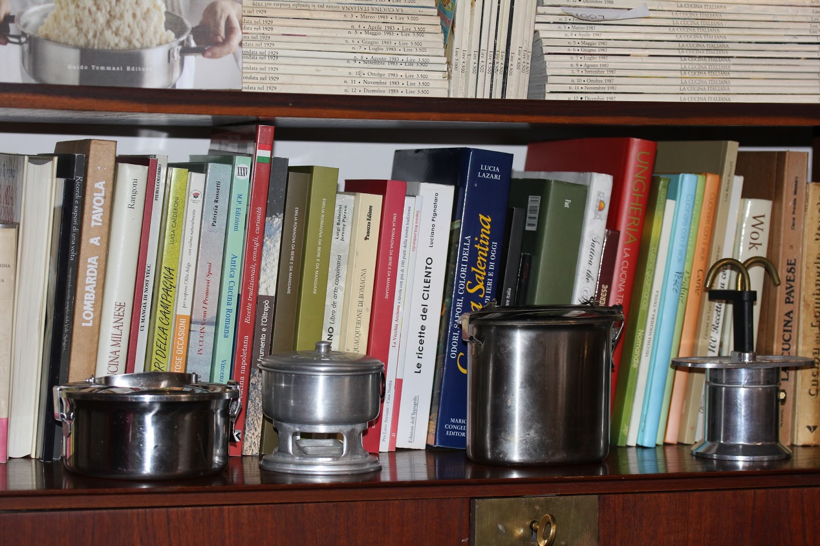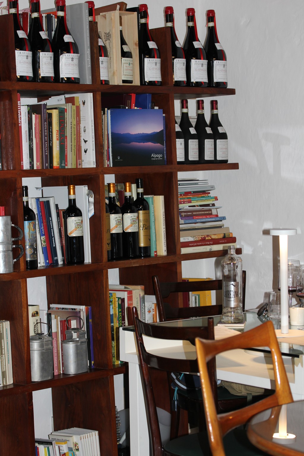 Nelle librerie bottiglie di vino e una fornitissima collezione di libri su tutti gli aspetti dell'arte culinaria. |
