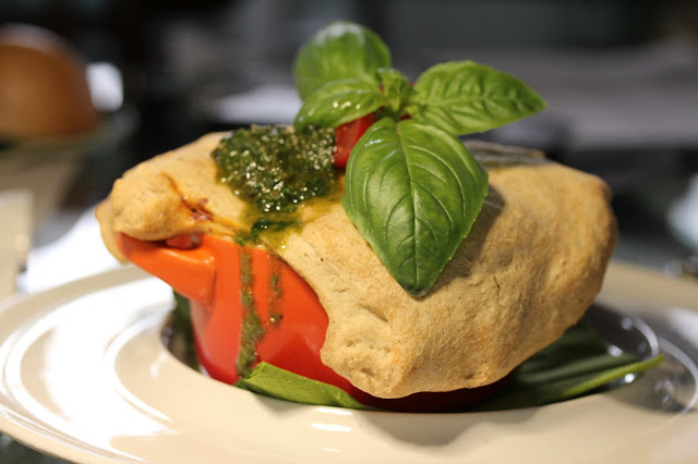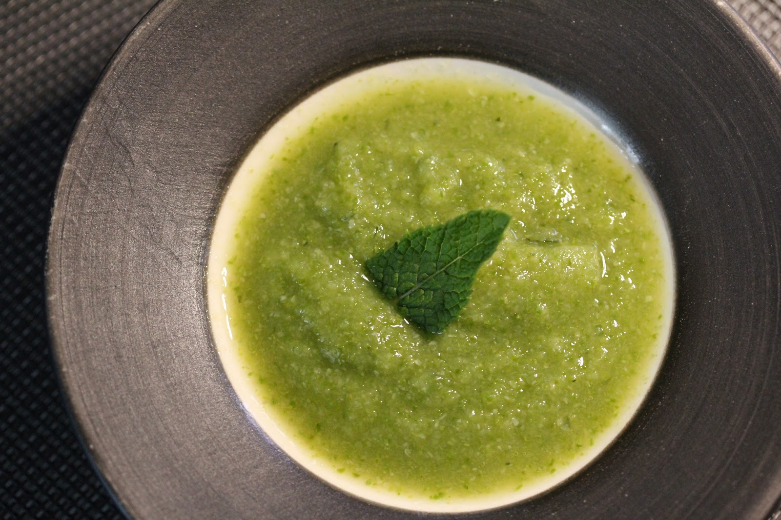 Crema di zucchine e menta. Una Parmigiana di Melanzane con coperchio di pane. |