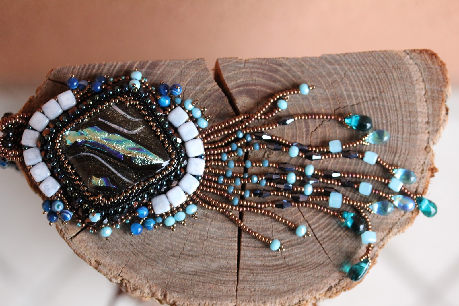 In occasione dell'ultimo corso di embroidery tenuto da Barbara D'Oria (non vi farò mancare dettagliato diario!) ci ha portato degli stupendi vetri dicroici che aveva realizzato tempo fa, per vedere se potevano prestarsi come cabochon per l'embroidery. Ovviamente appena li abbiamo visti io e Barbara ci siamo entusiasmate all'idea di sperimentare nuovi materiali così belli e originali.