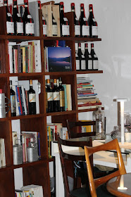 | Nelle librerie bottiglie di vino e una fornitissima collezione di libri su tutti gli aspetti dell'arte culinaria. |