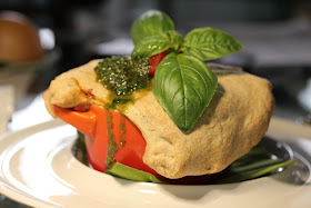 | Crema di zucchine e menta. Una Parmigiana di Melanzane con coperchio di pane. |